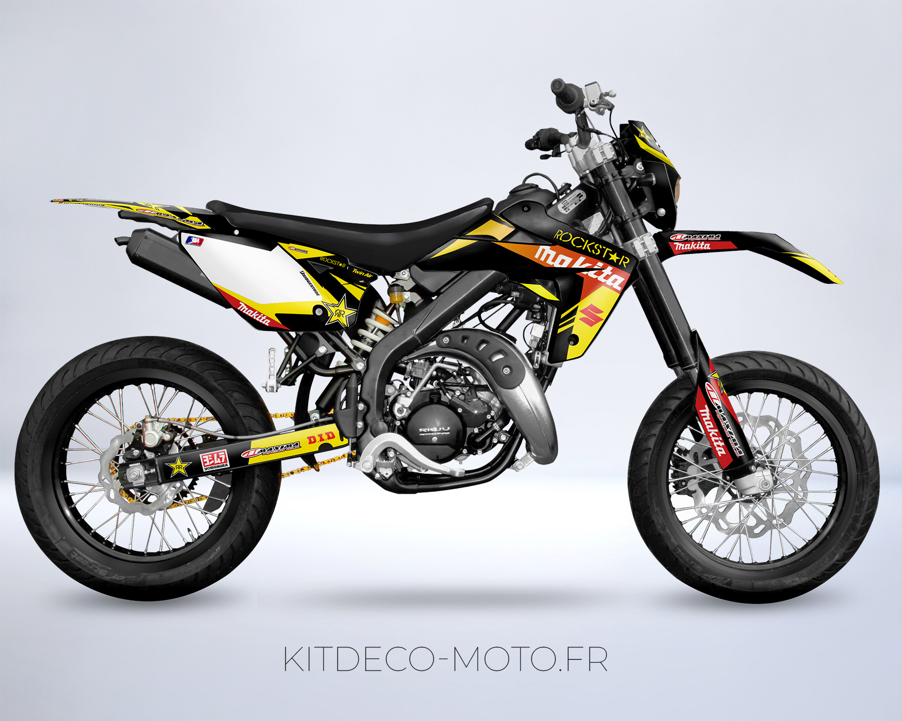 Avec le Kit déco Rieju 50 MRT – Rockstar, votre moto devient unique et vous aussi. Alors qu’attendez-vous pour donner du style à votre moto ? 🏍️