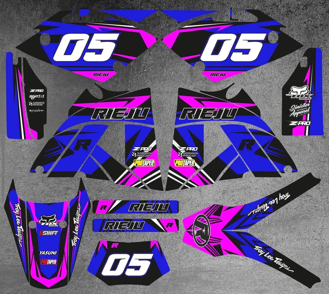 Pour une personnalisation encore plus poussée, vous pouvez customiser votre Kit déco Rieju 50 MRX – Craft Bleu / Rose avec nos différentes options comme la base du Kit déco, la finition et pourquoi pas ajouter votre pseudo ou bien changer le numéro.