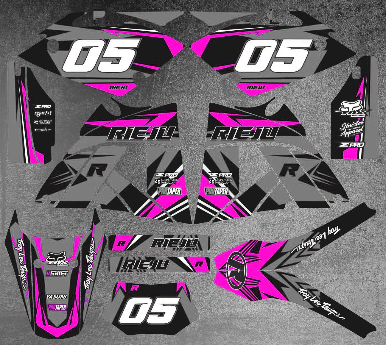 Pour une personnalisation encore plus poussée, vous pouvez customiser votre Kit déco Rieju 50 MRX – Craft Gris / Rose avec nos différentes options comme la base du Kit déco, la finition et pourquoi pas ajouter votre pseudo ou bien changer le numéro.