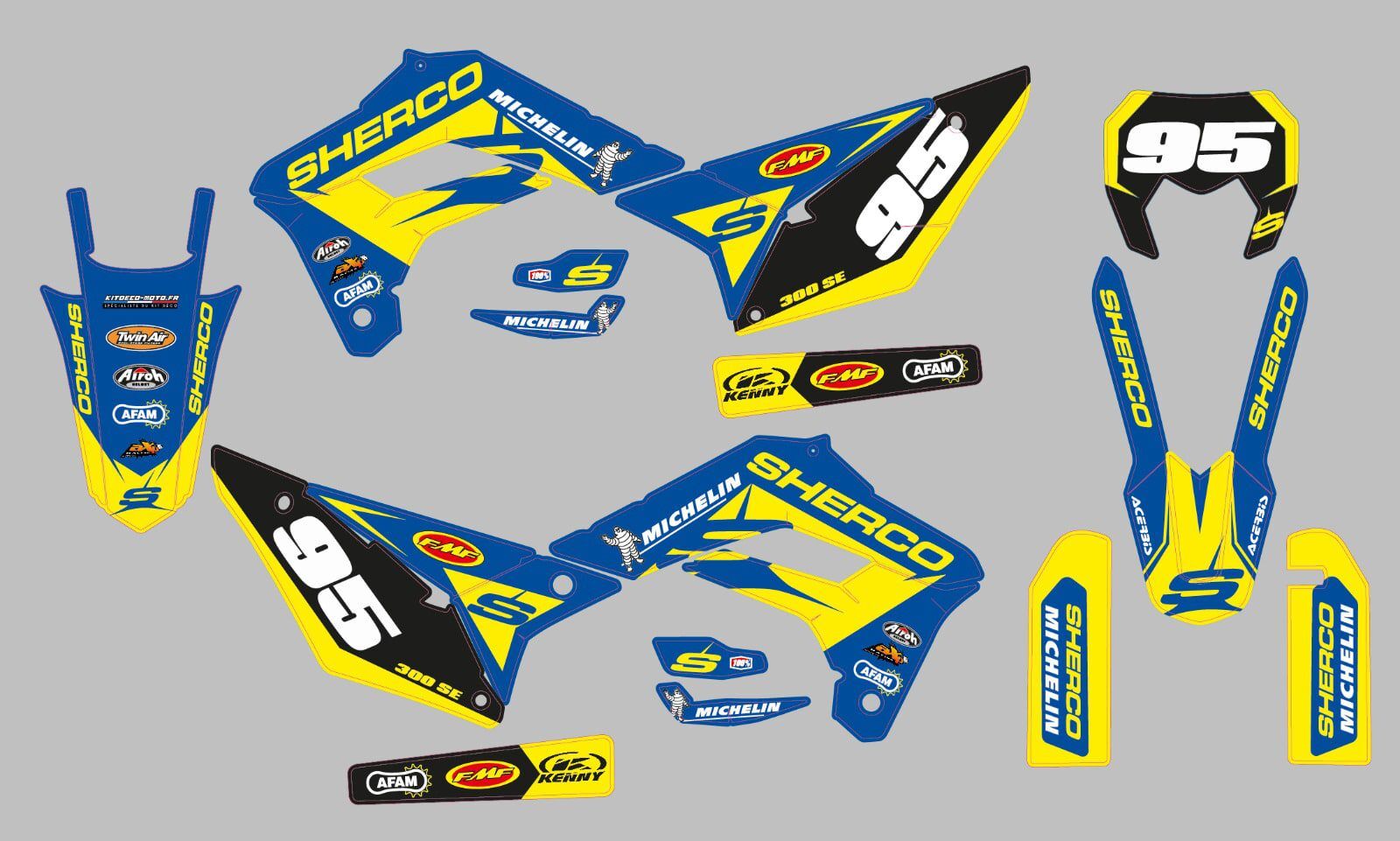 Kitdeco-moto.fr vous propose le kit déco Sherco Factory ! Possibilité de personnalisation (numéro, pseudo, couleurs, …) et d’ajout de jaune fluo.