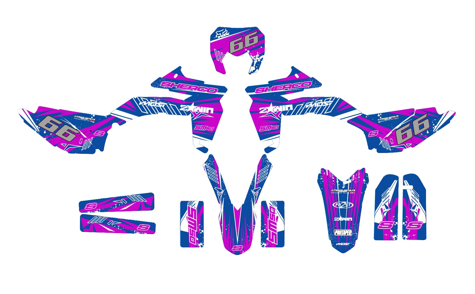 Pour une personnalisation encore plus poussée, vous pouvez customiser votre Kit déco Sherco 50 SM – Twin Bleu / Rose avec nos différentes options comme la base du Kit déco, la finition et pourquoi pas ajouter votre pseudo ou bien changer le numéro.