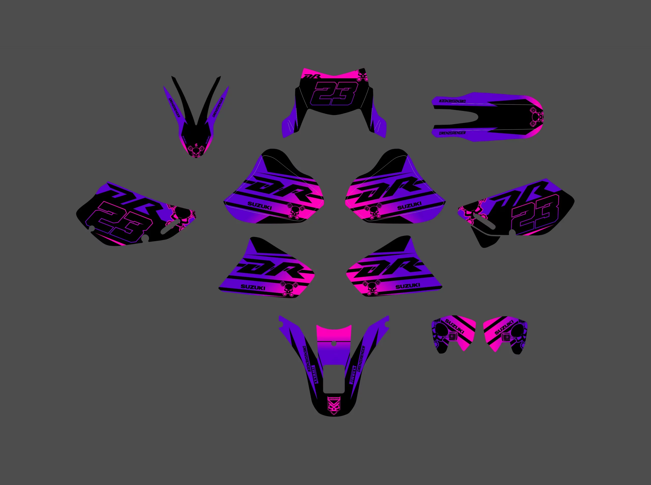 Pour une personnalisation encore plus poussée, vous pouvez customiser votre Kit déco Suzuki DR 650 – Purple avec nos différentes options comme la base du Kit déco, la finition et pourquoi pas ajouter votre pseudo ou bien changer le numéro.