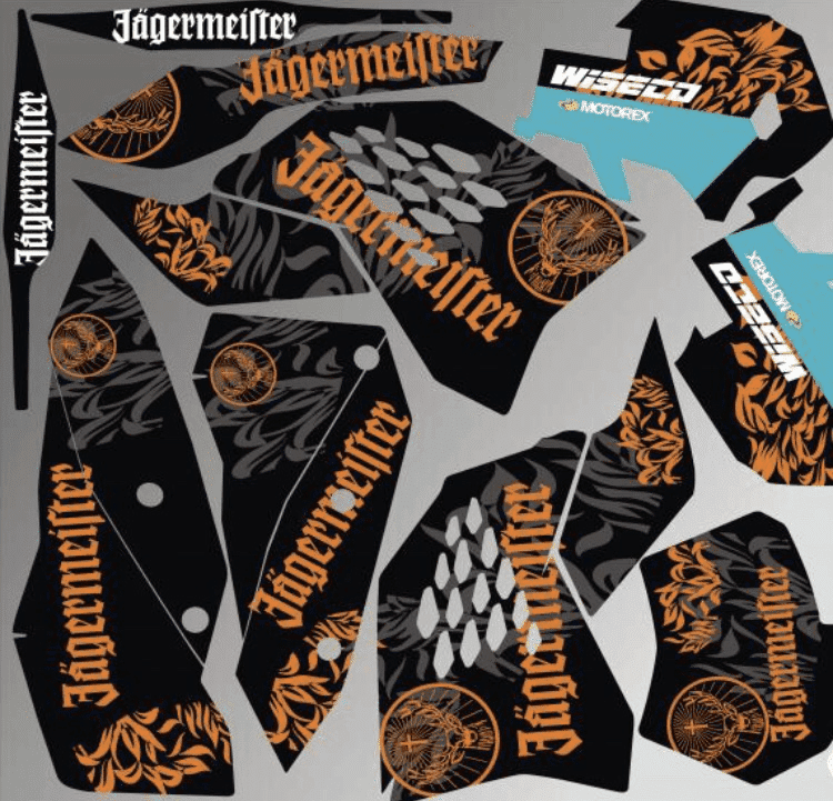 Avec le Kit déco KTM SX / SXF (2007-2010) – JAGERMEISTER, votre moto devient unique et vous aussi. Alors qu’attendez-vous pour donner du style à votre moto ? 🏍️