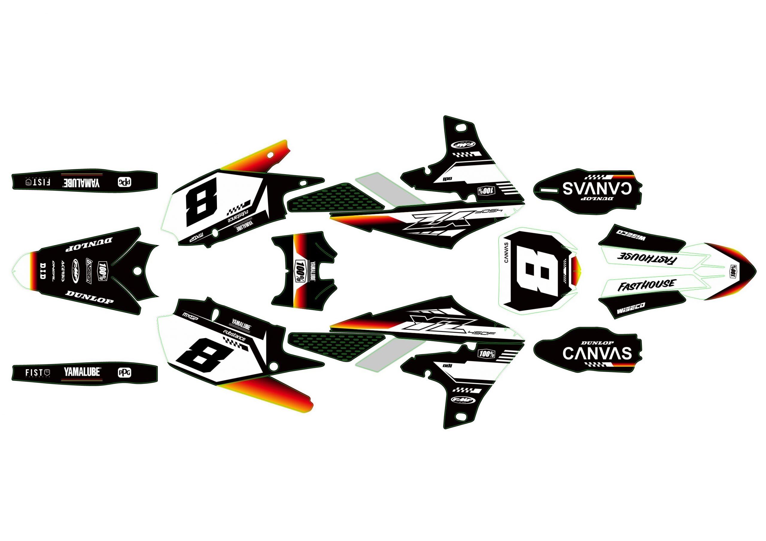 Pour une personnalisation encore plus poussée, vous pouvez customiser votre Kit déco Yamaha 250 YZF (2019-2023) – Effet avec nos différentes options comme la base du Kit déco, la finition et pourquoi pas ajouter votre pseudo ou bien changer le numéro.