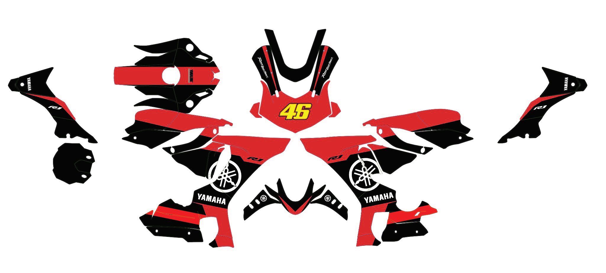 Pour une personnalisation encore plus poussée, vous pouvez customiser votre Kit déco Yamaha R1 – Factory Rouge avec nos différentes options comme la base du Kit déco, la finition et pourquoi pas ajouter votre pseudo ou bien changer le numéro.