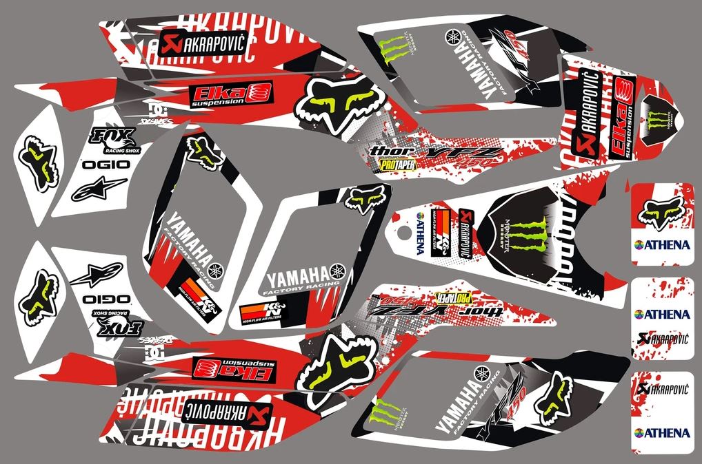 Pour une personnalisation encore plus poussée, vous pouvez customiser votre Kit déco Yamaha YFM 450 YFZ- Fox Red avec nos différentes options comme la base du Kit déco, la finition et pourquoi pas ajouter votre pseudo ou bien changer le numéro.