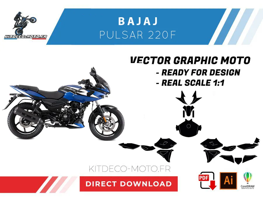 Kitdeco-moto propose le gabarit vectoriel de Bajaj Pulsar 220F. Le fichier est téléchargeable après votre achat directement sur votre compte. Le modèle est mis à l’échelle et il est prêt à être utilisé.