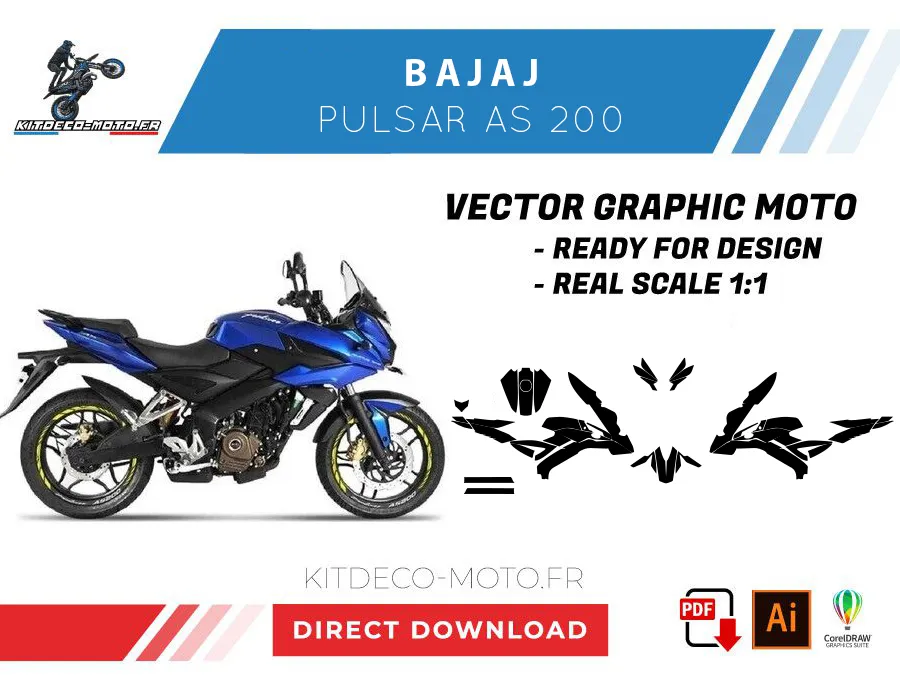 Kitdeco-moto propose le gabarit vectoriel de Bajaj Pulsar AS 200. Le fichier est téléchargeable après votre achat directement sur votre compte. Le modèle est mis à l’échelle et il est prêt à être utilisé.