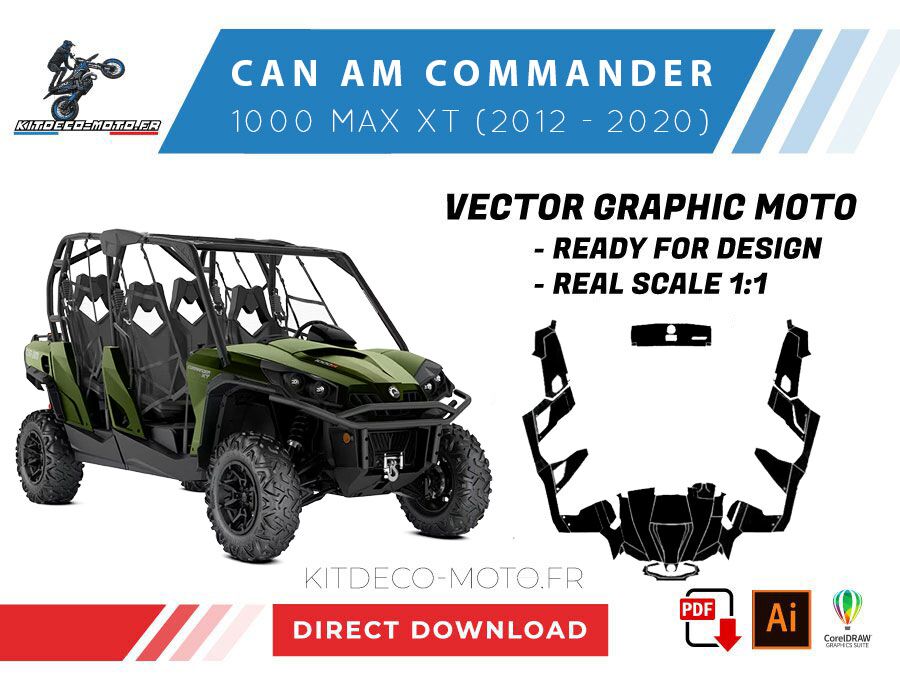 Kitdeco-moto propose le gabarit vectoriel de CAN AM COMMANDER 1000 MAX XT de 2012 à 2020. Le fichier est téléchargeable après votre achat directement sur votre compte. Le modèle est mis à l’échelle et il est prêt à être utilisé.