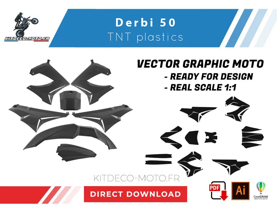 Kitdeco-moto propose le gabarit vectoriel de Derbi 50 TNT. Le fichier est téléchargeable après votre achat directement sur votre compte. Le modèle est mis à l’échelle et il est prêt à être utilisé.