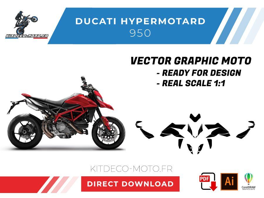 Kitdeco-moto propose le gabarit vectoriel de Ducati Hypermotard 950. Le fichier est téléchargeable après votre achat directement sur votre compte. Le modèle est mis à l’échelle et il est prêt à être utilisé.