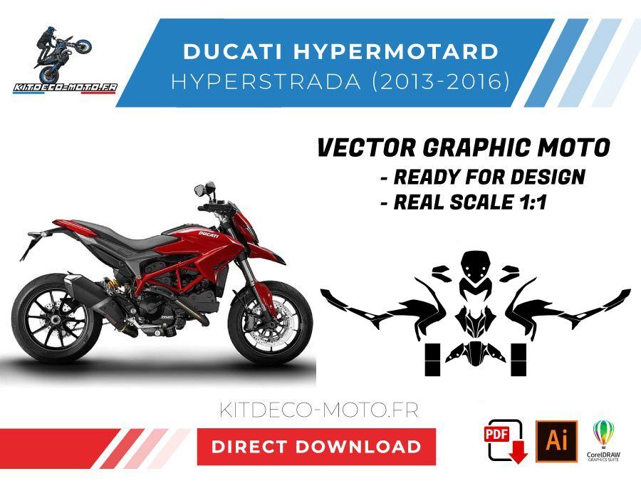 Kitdeco-moto propose le gabarit vectoriel de Ducati HYPERMOTARD HYPERSTRADA de 2013, 2014, 2015 et 2016. Le fichier est téléchargeable après votre achat directement sur votre compte. Le modèle est mis à l’échelle et il est prêt à être utilisé.