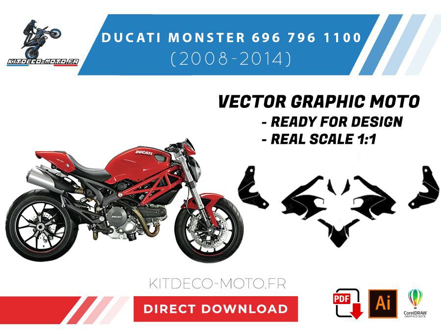Kitdeco-moto propose le gabarit vectoriel de Ducati Monster 696 796 1100 de 2008 à 2014. Le fichier est téléchargeable après votre achat directement sur votre compte. Le modèle est mis à l’échelle et il est prêt à être utilisé.