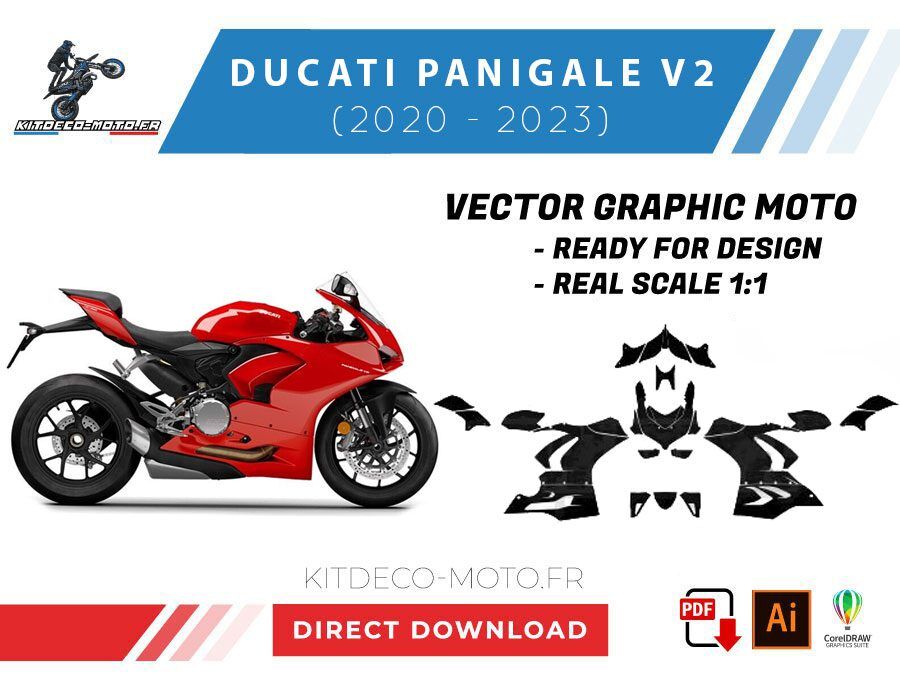 Kitdeco-moto propose le gabarit vectoriel de Ducati Panigale V2 de 2020, 2021 et 2022. Le fichier est téléchargeable après votre achat directement sur votre compte. Le modèle est mis à l’échelle et il est prêt à être utilisé.