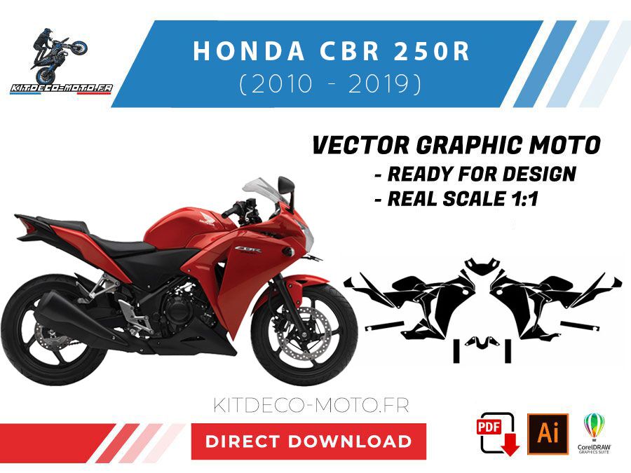 Kitdeco-moto propose le gabarit vectoriel de Honda CBR 250R de 2010 à 2019. Le fichier est téléchargeable après votre achat directement sur votre compte. Le modèle est mis à l’échelle et il est prêt à être utilisé.