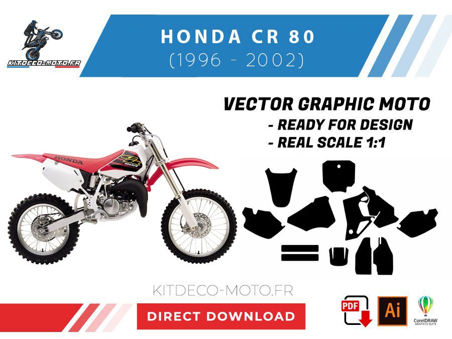 Kitdeco-moto propose le gabarit vectoriel de Honda CR 80 de 1996 à 2002. Le fichier est téléchargeable après votre achat directement sur votre compte. Le modèle est mis à l’échelle et il est prêt à être utilisé.