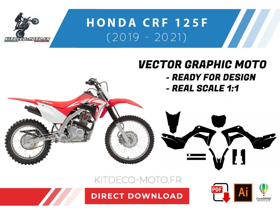 Kitdeco-moto propose le gabarit vectoriel de Honda CRF 125F (2019-2021). Le fichier est téléchargeable après votre achat directement sur votre compte. Le modèle est mis à l’échelle et il est prêt à être utilisé.