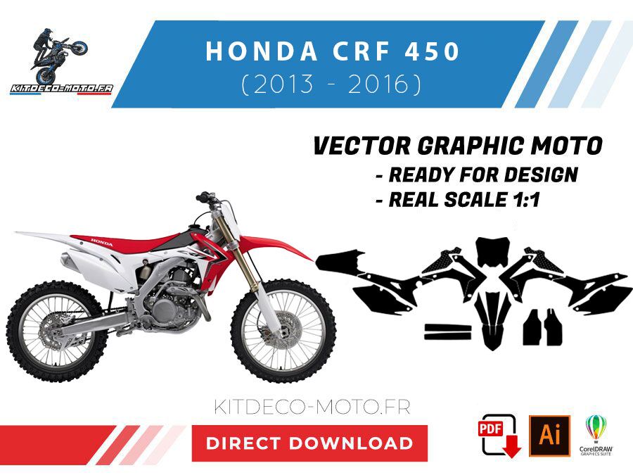 Kitdeco-moto propose le gabarit vectoriel de Honda CRF 450 de 2013 à 2016. Le fichier est téléchargeable après votre achat directement sur votre compte. Le modèle est mis à l’échelle et il est prêt à être utilisé.