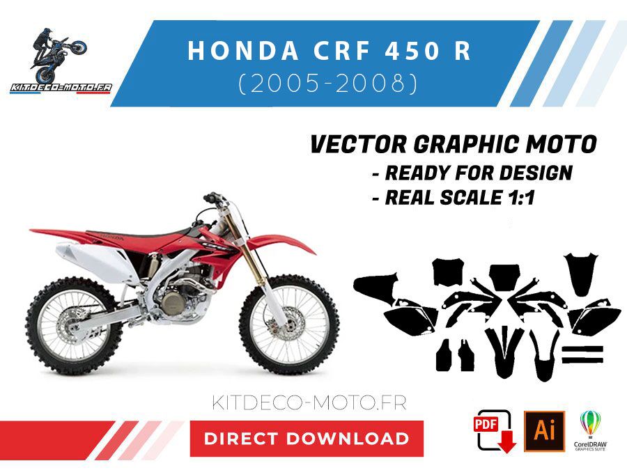 Kitdeco-moto propose le gabarit vectoriel de Honda CRF 450 R de 2005 à 2008. Le fichier est téléchargeable après votre achat directement sur votre compte. Le modèle est mis à l’échelle et il est prêt à être utilisé.