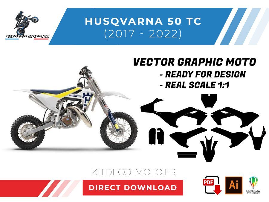 Kitdeco-moto propose le gabarit vectoriel de Husqvarna 50 TC de 2017 à 2022. Le fichier est téléchargeable après votre achat directement sur votre compte. Le modèle est mis à l’échelle et il est prêt à être utilisé.