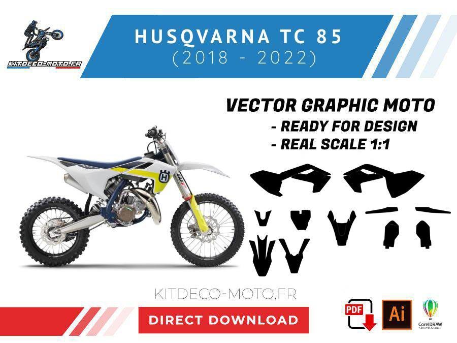 Kitdeco-moto propose le gabarit vectoriel de Husqvarna TC 85 de 2018, 2019, 2020, 2021 et 2022. Le fichier est téléchargeable après votre achat directement sur votre compte. Le modèle est mis à l’échelle et il est prêt à être utilisé.