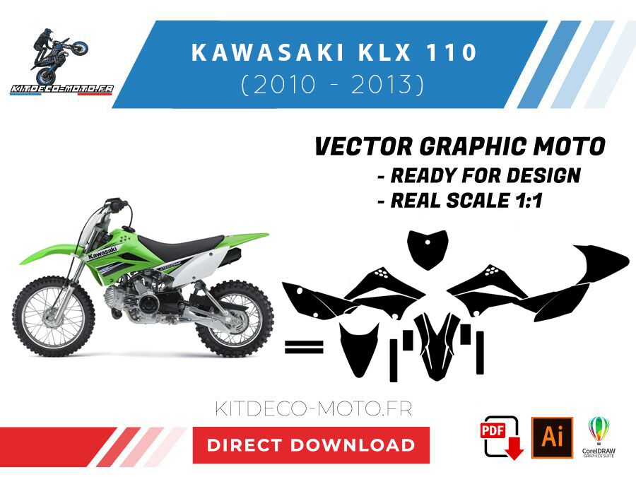 Kitdeco-moto propose le gabarit vectoriel de Kawasaki 110 KLX de 2010 à 2013. Le fichier est téléchargeable après votre achat directement sur votre compte. Le modèle est mis à l’échelle et il est prêt à être utilisé.