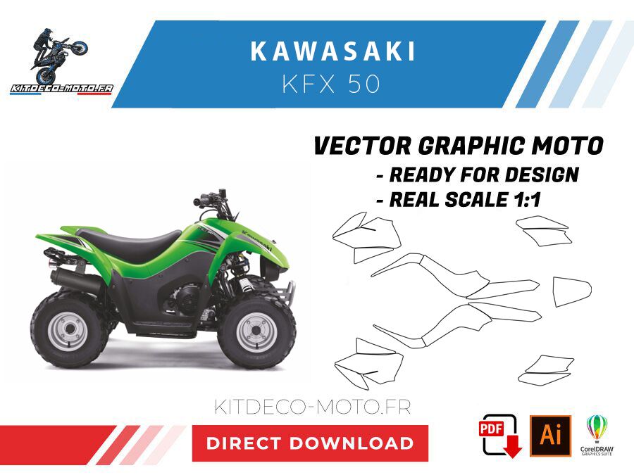 Kitdeco-moto propose le gabarit vectoriel de Kawasaki 50 KFX. Le fichier est téléchargeable après votre achat directement sur votre compte. Le modèle est mis à l’échelle et il est prêt à être utilisé.