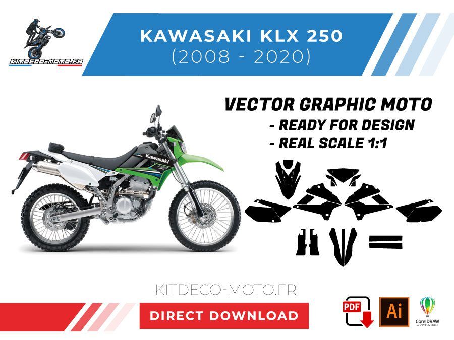 Kitdeco-moto propose le gabarit vectoriel de Kawasaki KLX 250 de 2008 à 2020. Le fichier est téléchargeable après votre achat directement sur votre compte. Le modèle est mis à l’échelle et il est prêt à être utilisé.