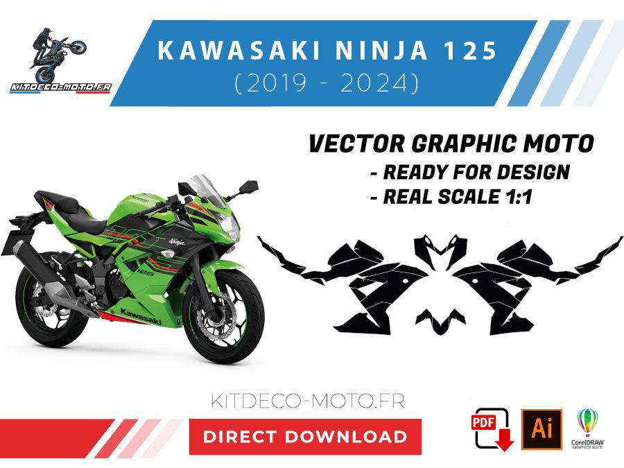 Kitdeco-moto propose le gabarit vectoriel de Kawasaki Ninja 125 de 2019 à 2024. Le fichier est téléchargeable après votre achat directement sur votre compte. Le modèle est mis à l’échelle et il est prêt à être utilisé.