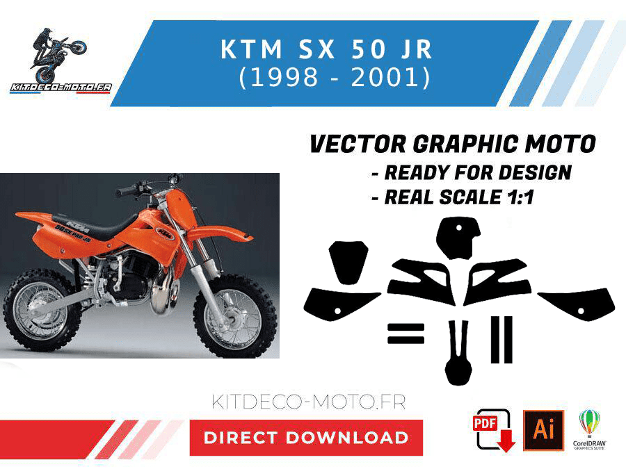 Kitdeco-moto propose le gabarit vectoriel de KTM 50 JR. Le fichier est téléchargeable après votre achat directement sur votre compte. Le modèle est mis à l’échelle et il est prêt à être utilisé.