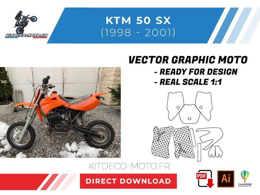 Kitdeco-moto propose le gabarit vectoriel de KTM 50 SX de 1998, 1999, 2000 et 2001. Le fichier est téléchargeable après votre achat directement sur votre compte. Le modèle est mis à l’échelle et il est prêt à être utilisé.