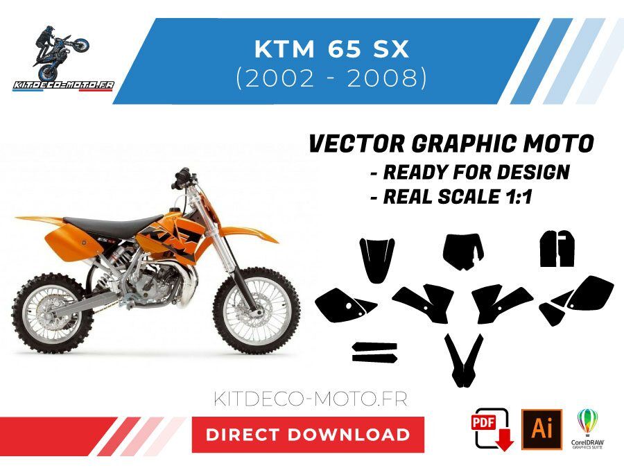 Kitdeco-moto propose le gabarit vectoriel de KTM 65 SX de 2002, 2003, 2004, 2005, 2006, 2007 et 2008. Le fichier est téléchargeable après votre achat directement sur votre compte. Le modèle est mis à l’échelle et il est prêt à être utilisé.