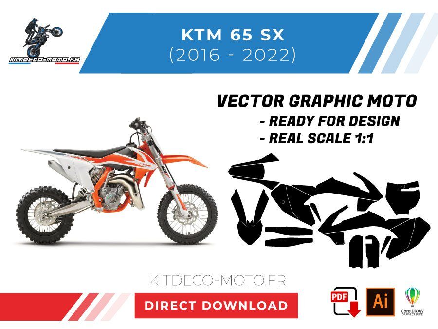 Kitdeco-moto propose le gabarit vectoriel de KTM 65 SX de 2016, 2017, 2018, 2019, 2020, 2021 et 2022. Le fichier est téléchargeable après votre achat directement sur votre compte. Le modèle est mis à l’échelle et il est prêt à être utilisé.
