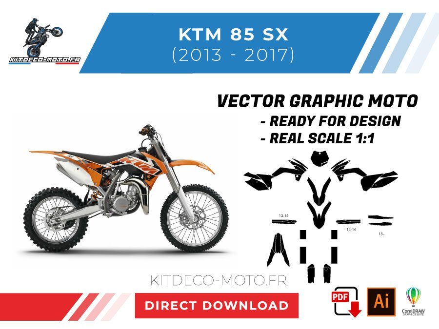 Kitdeco-moto propose le gabarit vectoriel de KTM 85 SX de 2013, 2014, 2015, 2016 et 2017. Le fichier est téléchargeable après votre achat directement sur votre compte. Le modèle est mis à l’échelle et il est prêt à être utilisé.