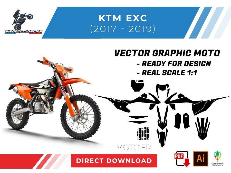 Kitdeco-moto propose le gabarit vectoriel de KTM EXC de 2017, 2018 et 2019. Le fichier est téléchargeable après votre achat directement sur votre compte. Le modèle est mis à l’échelle et il est prêt à être utilisé.
