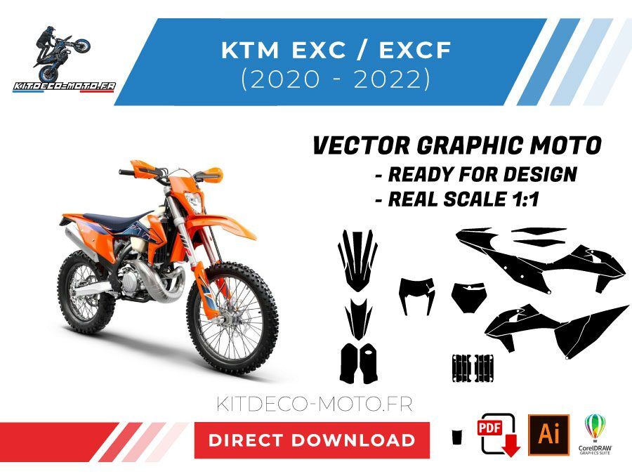 Kitdeco-moto propose le gabarit vectoriel de KTM 125 / 250 / 300 / 350 / 450 / 500 EXC-EXCF de 2020, 2021, 2022 et 2023. Le fichier est téléchargeable après votre achat directement sur votre compte. Le modèle est mis à l’échelle et il est prêt à être utilisé.