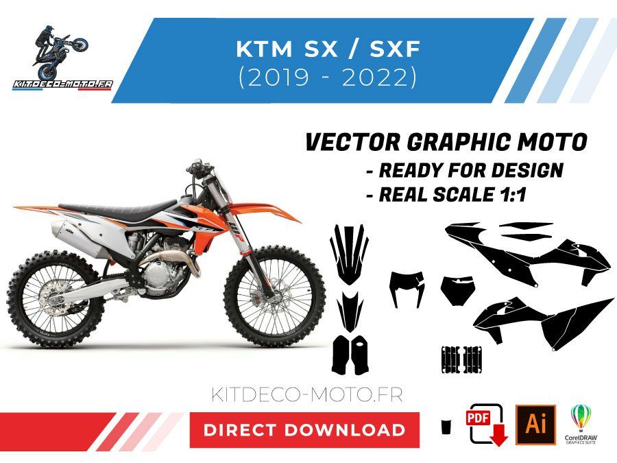 Kitdeco-moto propose le gabarit vectoriel de KTM 125 / 150 / 250 / 350 / 450 SX-SXF de 2019, 2020, 2021 et 2022. Le fichier est téléchargeable après votre achat directement sur votre compte. Le modèle est mis à l’échelle et il est prêt à être utilisé.