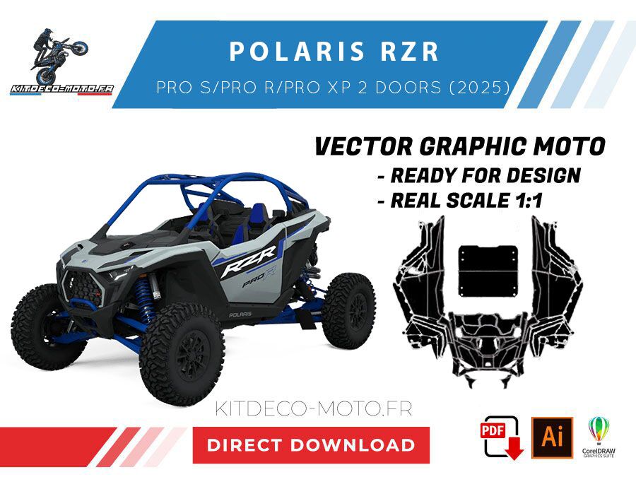 Kitdeco-moto propose le gabarit vectoriel de Polaris RZR Pro S / Pro R / Pro XP 2 Doors de 2025. Le fichier est téléchargeable après votre achat directement sur votre compte. Le modèle est mis à l’échelle et il est prêt à être utilisé.