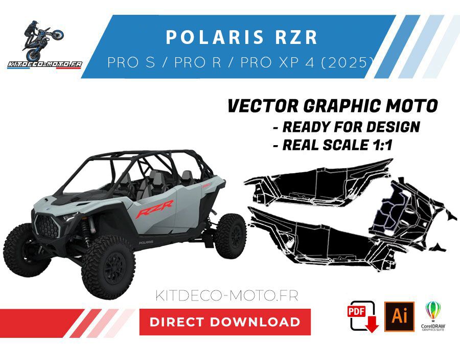 Kitdeco-moto propose le gabarit vectoriel de Polaris RZR PRO S / PRO R / PRO XP 4 de 2025. Le fichier est téléchargeable après votre achat directement sur votre compte. Le modèle est mis à l’échelle et il est prêt à être utilisé.