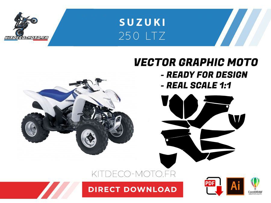 Kitdeco-moto propose le gabarit vectoriel de Suzuki 250 LTZ. Le fichier est téléchargeable après votre achat directement sur votre compte. Le modèle est mis à l’échelle et il est prêt à être utilisé.