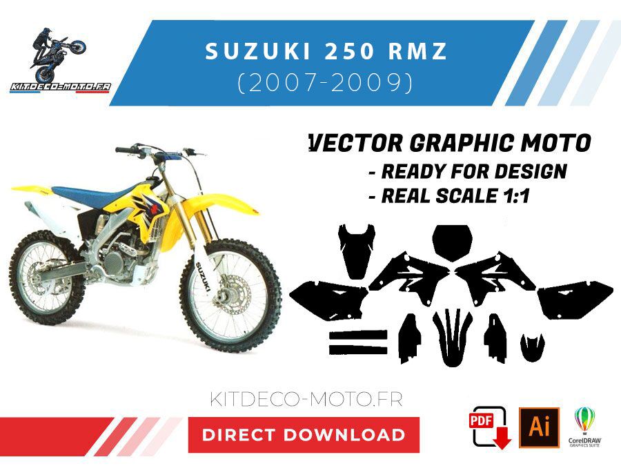 Kitdeco-moto propose le gabarit vectoriel de Suzuki 250 RMZ de 2007 à 2009. Le fichier est téléchargeable après votre achat directement sur votre compte. Le modèle est mis à l’échelle et il est prêt à être utilisé.