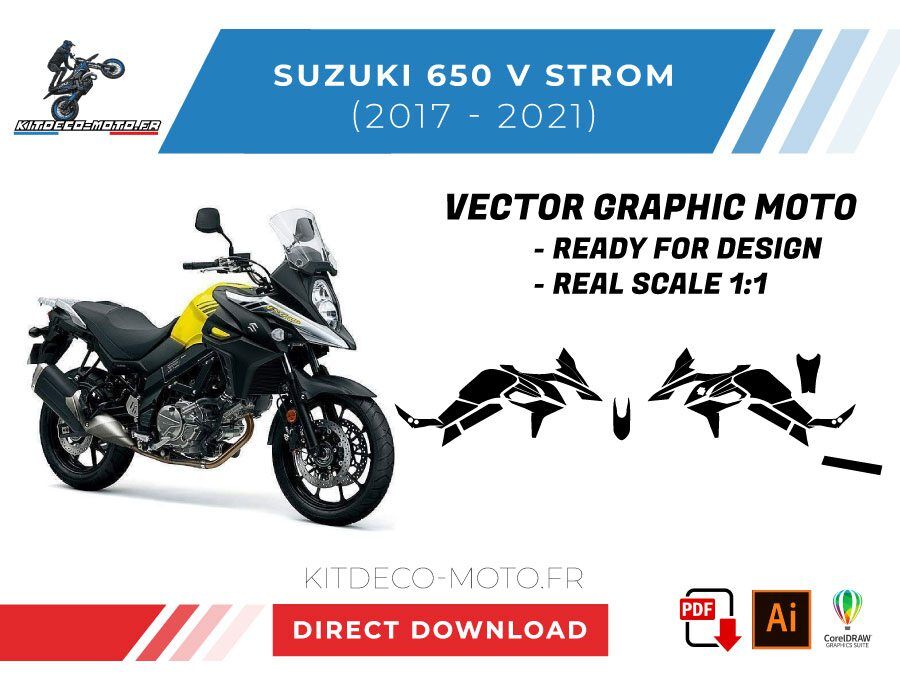 Kitdeco-moto propose le gabarit vectoriel de Suzuki 650 V STROM de 2017, 2018, 2019, 2020, 2021 et 2022. Le fichier est téléchargeable après votre achat directement sur votre compte. Le modèle est mis à l’échelle et il est prêt à être utilisé.
