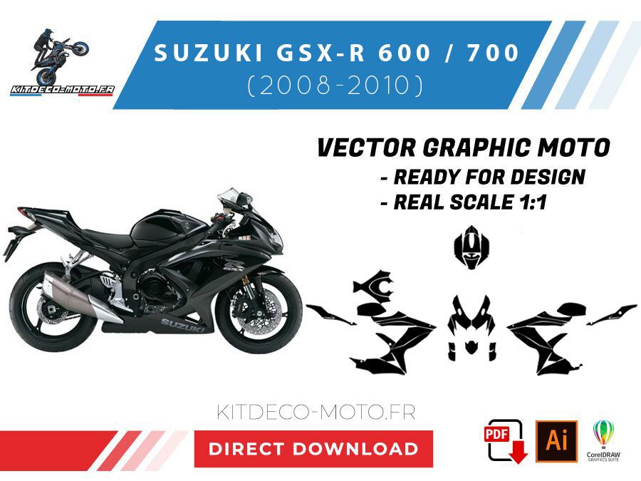 Kitdeco-moto propose le gabarit vectoriel de Suzuki GSX-R 600 / 750 de 2008 à 2010. Le fichier est téléchargeable après votre achat directement sur votre compte. Le modèle est mis à l’échelle et il est prêt à être utilisé.