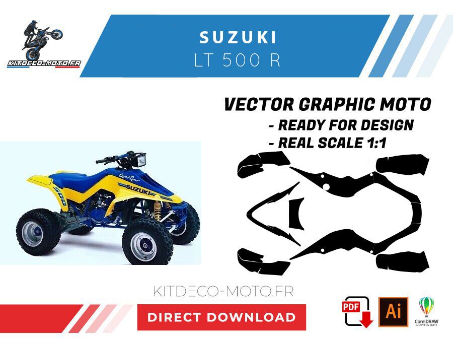 Kitdeco-moto propose le gabarit vectoriel de Suzuki LT500R. Le fichier est téléchargeable après votre achat directement sur votre compte. Le modèle est mis à l’échelle et il est prêt à être utilisé.