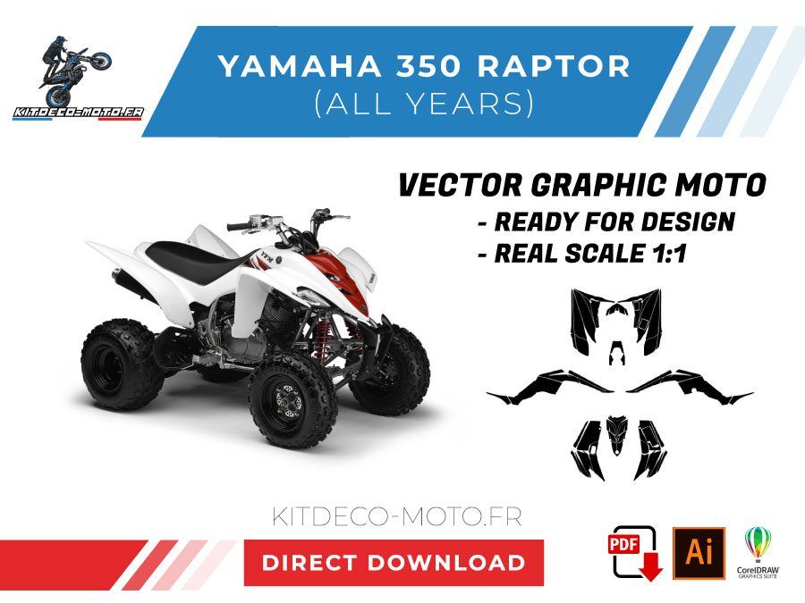 Kitdeco-moto propose le gabarit vectoriel de Yamaha 350 Raptor (toutes années). Le fichier est téléchargeable après votre achat directement sur votre compte. Le modèle est mis à l’échelle et il est prêt à être utilisé.