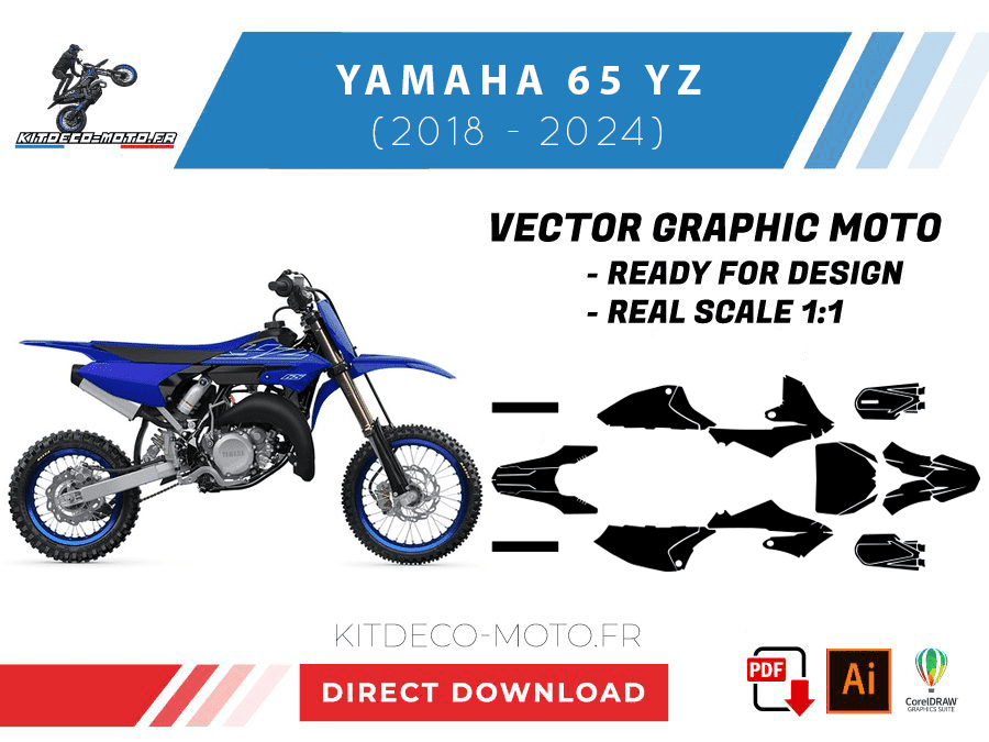 Kitdeco-moto propose le gabarit vectoriel de Yamaha 65 YZ de 2018, 2019, 2020, 2021, 2022, 2023 et 2024. Le fichier est téléchargeable après votre achat directement sur votre compte. Le modèle est mis à l’échelle et il est prêt à être utilisé.