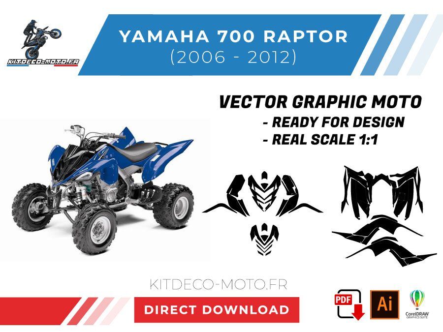 Kitdeco-moto propose le gabarit vectoriel de Yamaha 700 Raptor de 2006, 2007, 2008, 2009, 2010, 2011, 2012. Le fichier est téléchargeable après votre achat directement sur votre compte. Le modèle est mis à l’échelle et il est prêt à être utilisé.