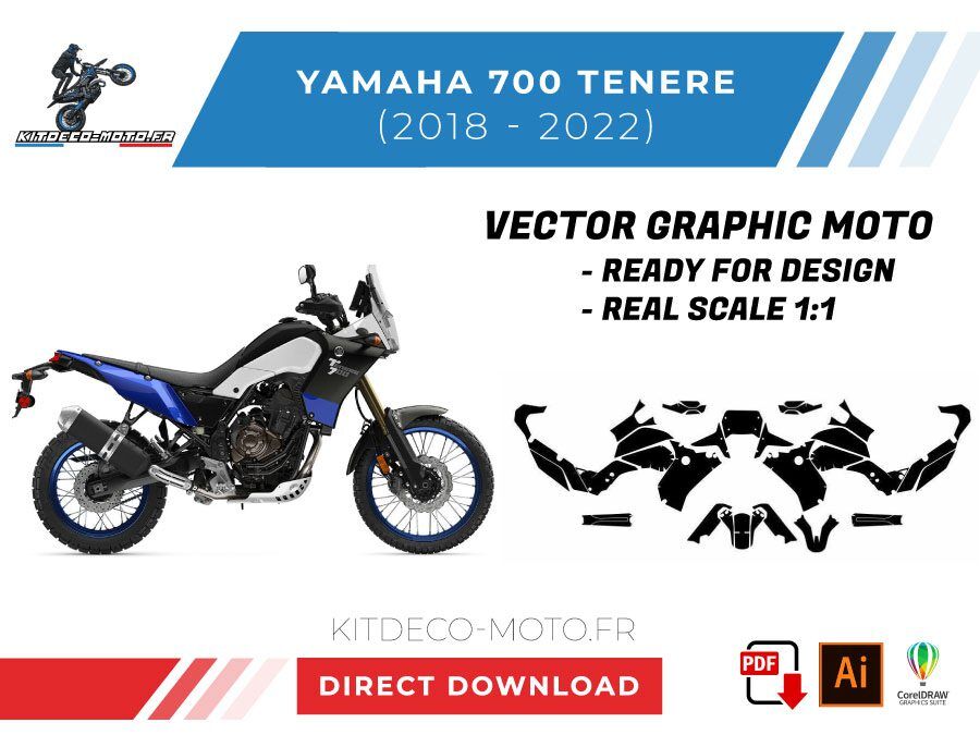 Kitdeco-moto propose le gabarit vectoriel de Yamaha 700 Tenere de 2018, 2019, 2020, 2021 et 2022. Le fichier est téléchargeable après votre achat directement sur votre compte. Le modèle est mis à l’échelle et il est prêt à être utilisé.